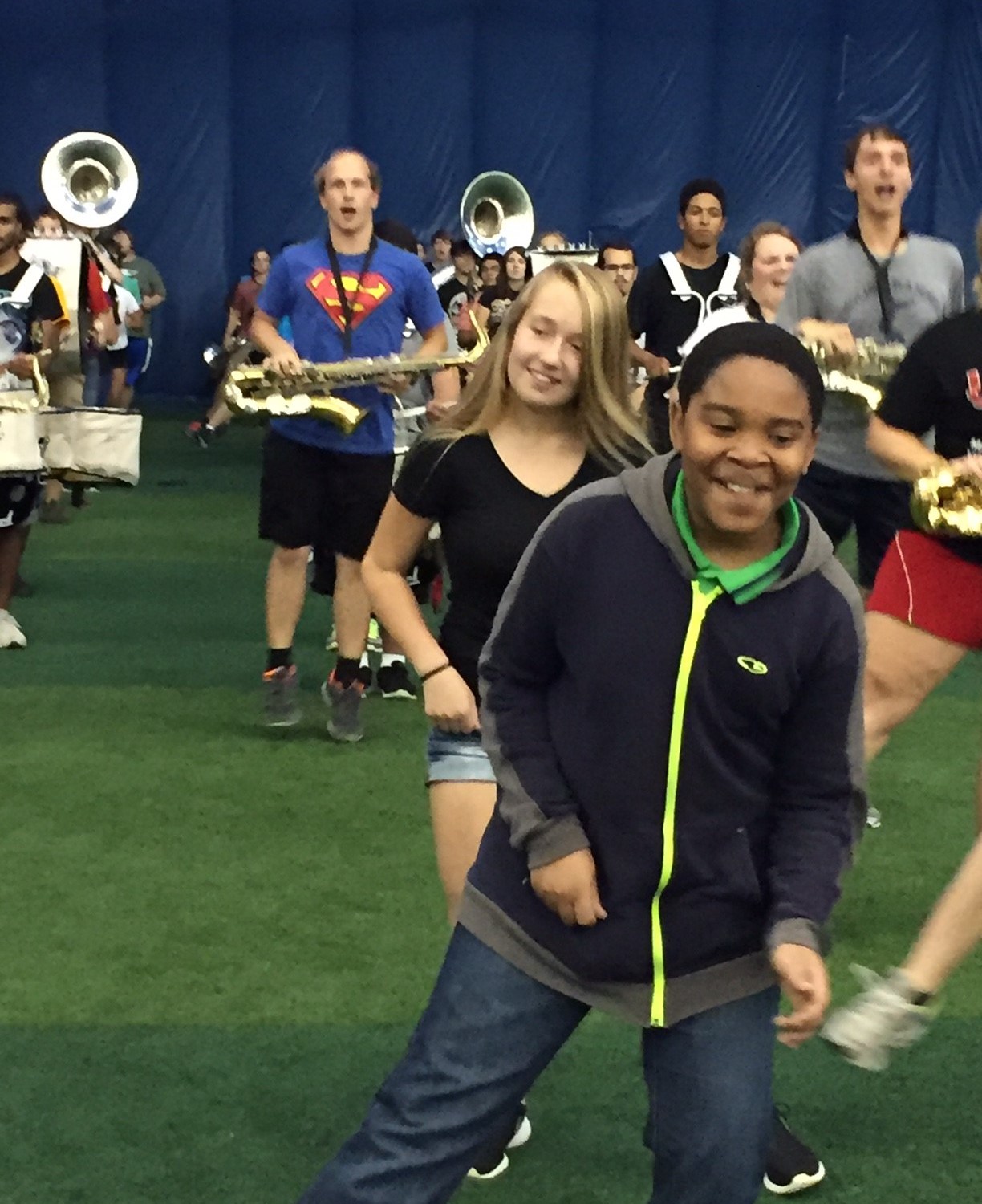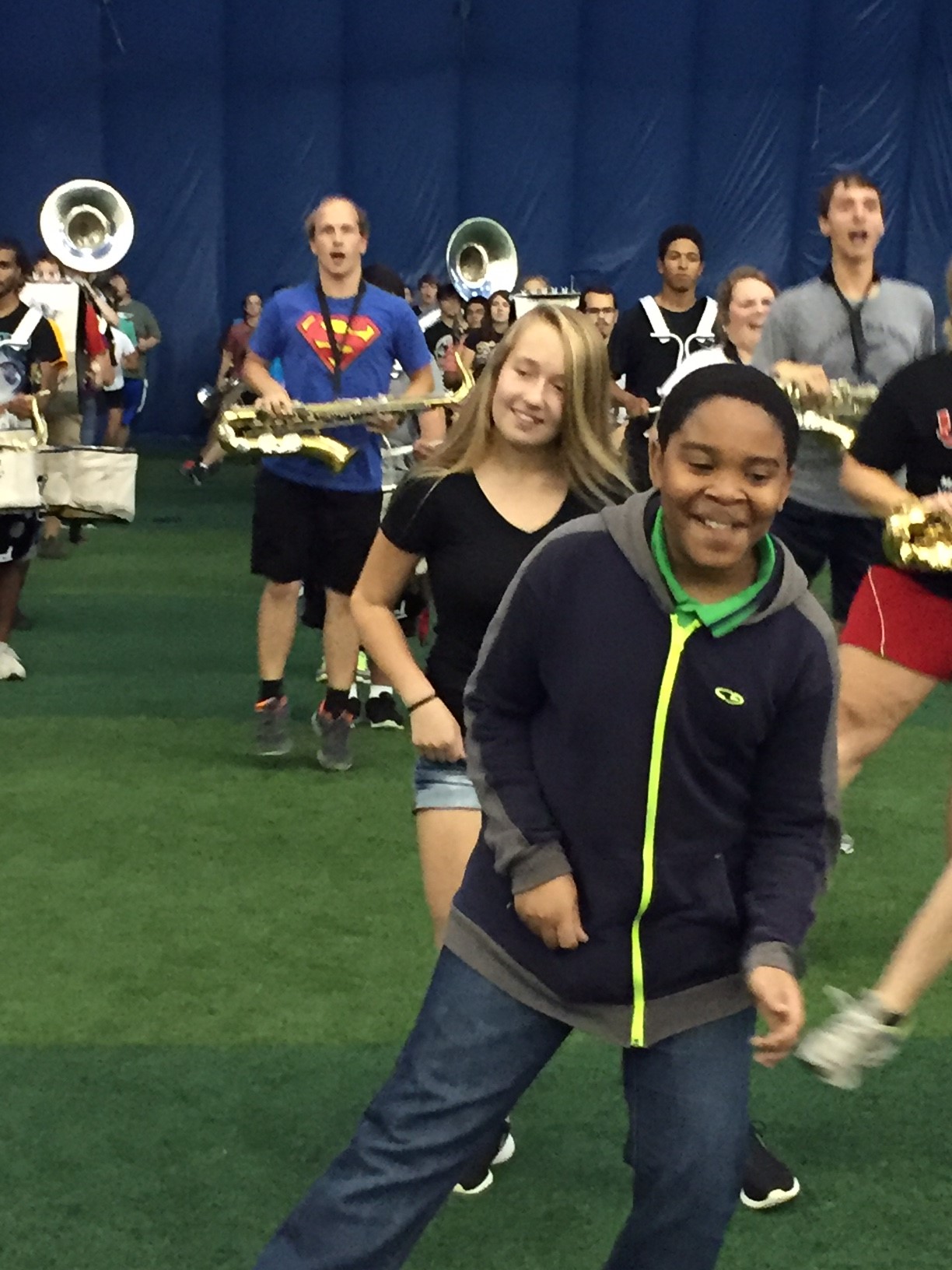Each year a music education student prepares a lesson introducing the students to marching band fundamentals. The following day, students meet their buddy and have the opportunity to walk alongside them in the marching band rehearsal. “This is a great opportunity for my students.” says Diane Diffey, their instrumental instructor. “The UNO students make the elementary students feel welcome and are really encouraging.”