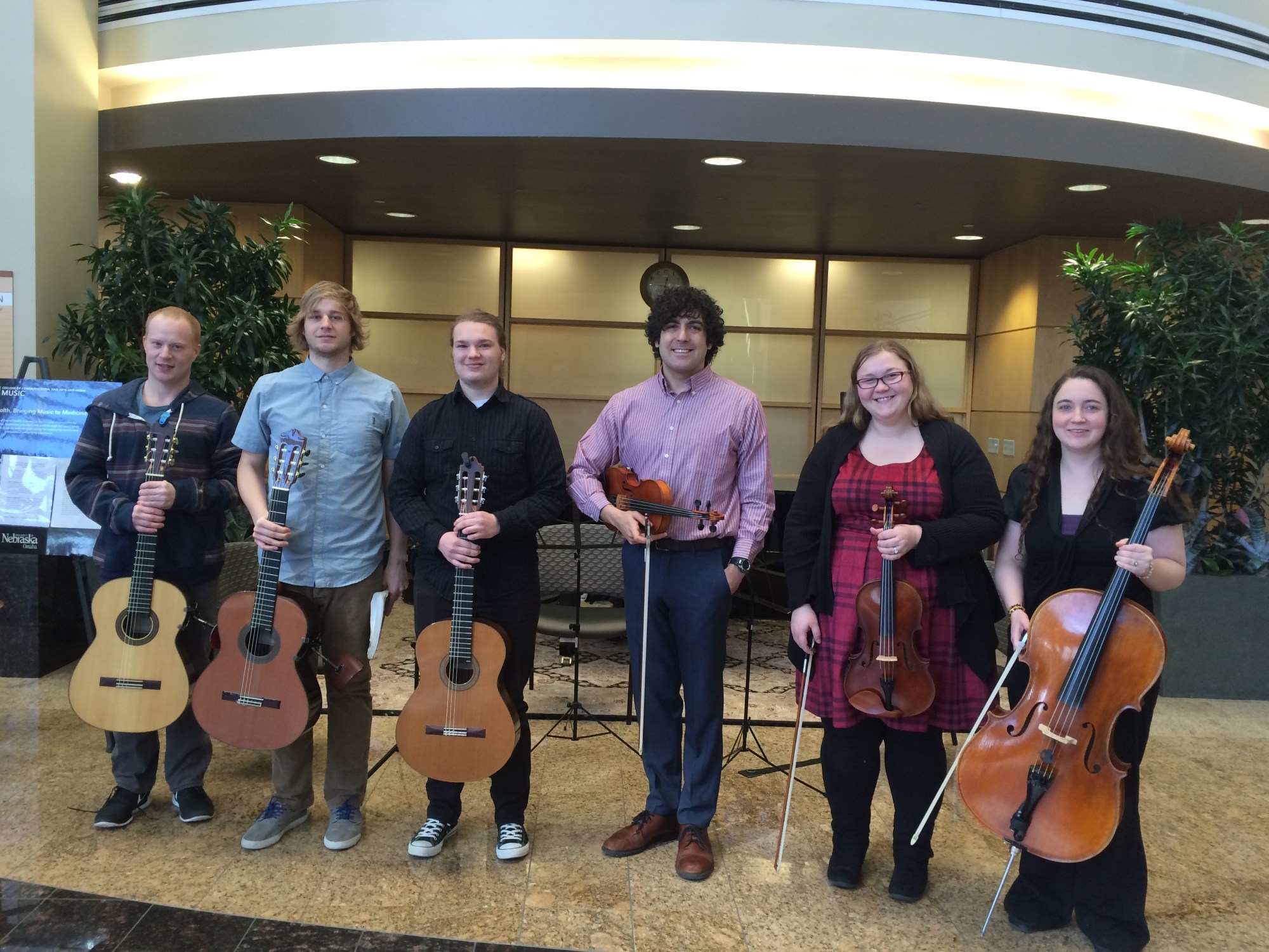 Six music majors from UNO’s School of Music participated in Sound Health on February 24 at Bergan Mercy Hospital, a service learning program that brings live music to area health care facilities. Student participants included: Jeremy Ahlstrom, guitar; Heidi Copeland, viola; Kevin Krause, guitar; Jackson Roberson, guitar; Danny Sabra, violin; and Joye Trimmel, cello.Listener feedback during the visit included: