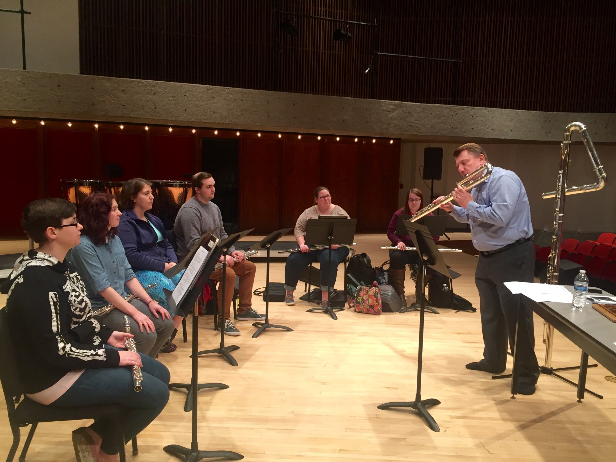 During his residency, two premieres took place in Omaha: the first with the UNO Symphonic Wind Ensemble, under the direction of Dr. Karen Fannin, whose concert on March 1 included the North American premiere of “Mud Dance” from Waiting for the Clouds to Part, a double concerto for solo alto/bass flute, solo flute/piccolo and wind ensemble by Australian composer, Houston Dunleavy (Sheridan and Beard, soloists). The second premiere took place during UNO’s Petite Musqiue series recital featuring Peter on Wednesday night, March 2. “Equinox” – a 16-minute concerto for solo alto flute and flute choir – was composed in 2016 by Omaha-based composer James-Michael Sellers specifically for Peter Sheridan and UNO’s Heartland Community Flute Choir.