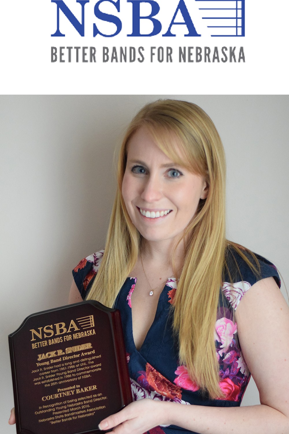 Courtney Baker, a 2012 UNO School of Music Alumnus, was one of two recipients of the Jack R. Snider Young Band Director Award presented at the Nebraska State Bandmasters Association Conference Banquet on Friday, March 4. Ms. Baker currently teaches band at Otte-Blair Middle School in Blair, NE and she is also concurrently pursuing her Masters degree in Music Education at UNO.