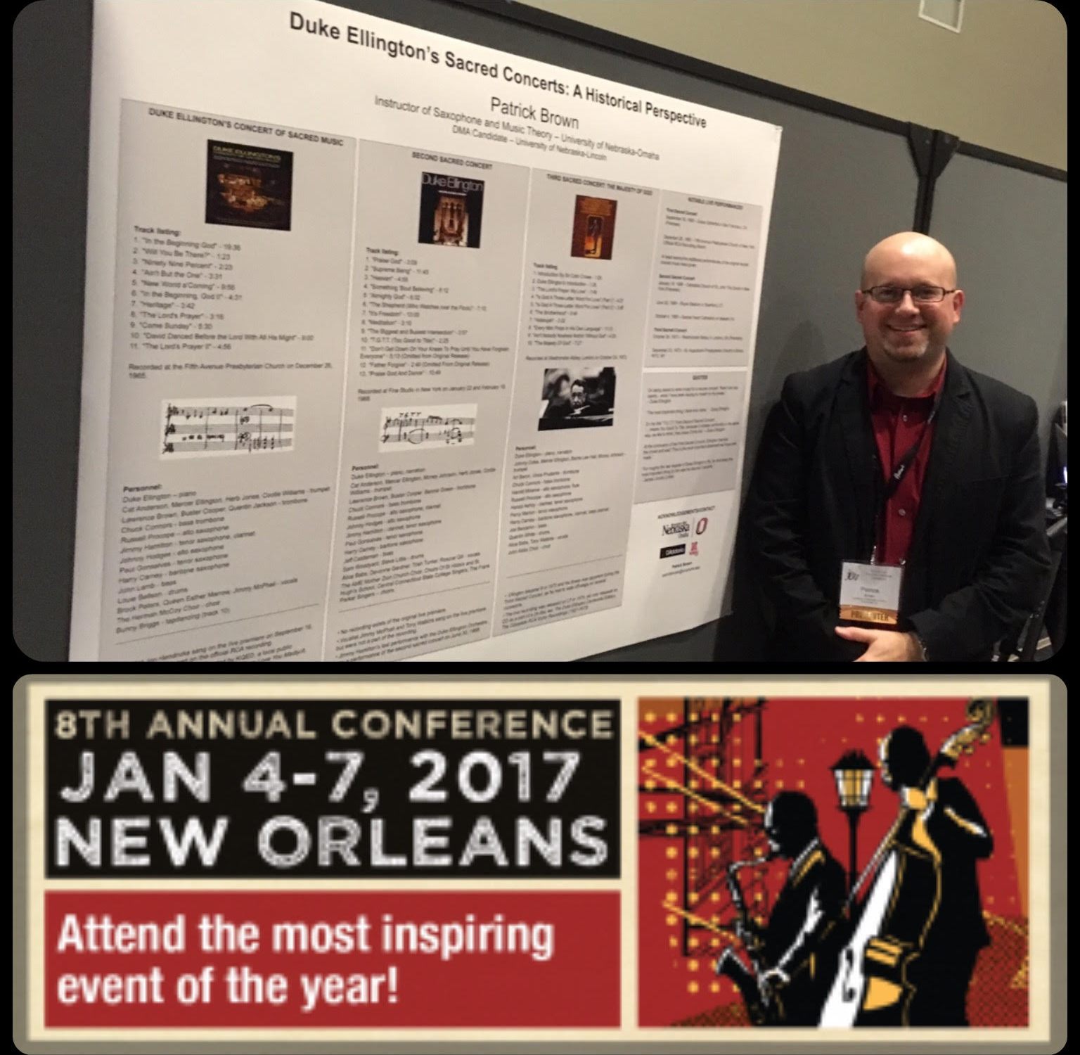 Patrick Brown, Instructor of Saxophone and Music Theory at University of Nebraska-Omaha, recently presented research at the 2017 Jazz Education Network Conference in New Orleans, Louisiana. The subject of his research was “Duke Ellington’s Sacred Concerts: A Historical Perspective.”