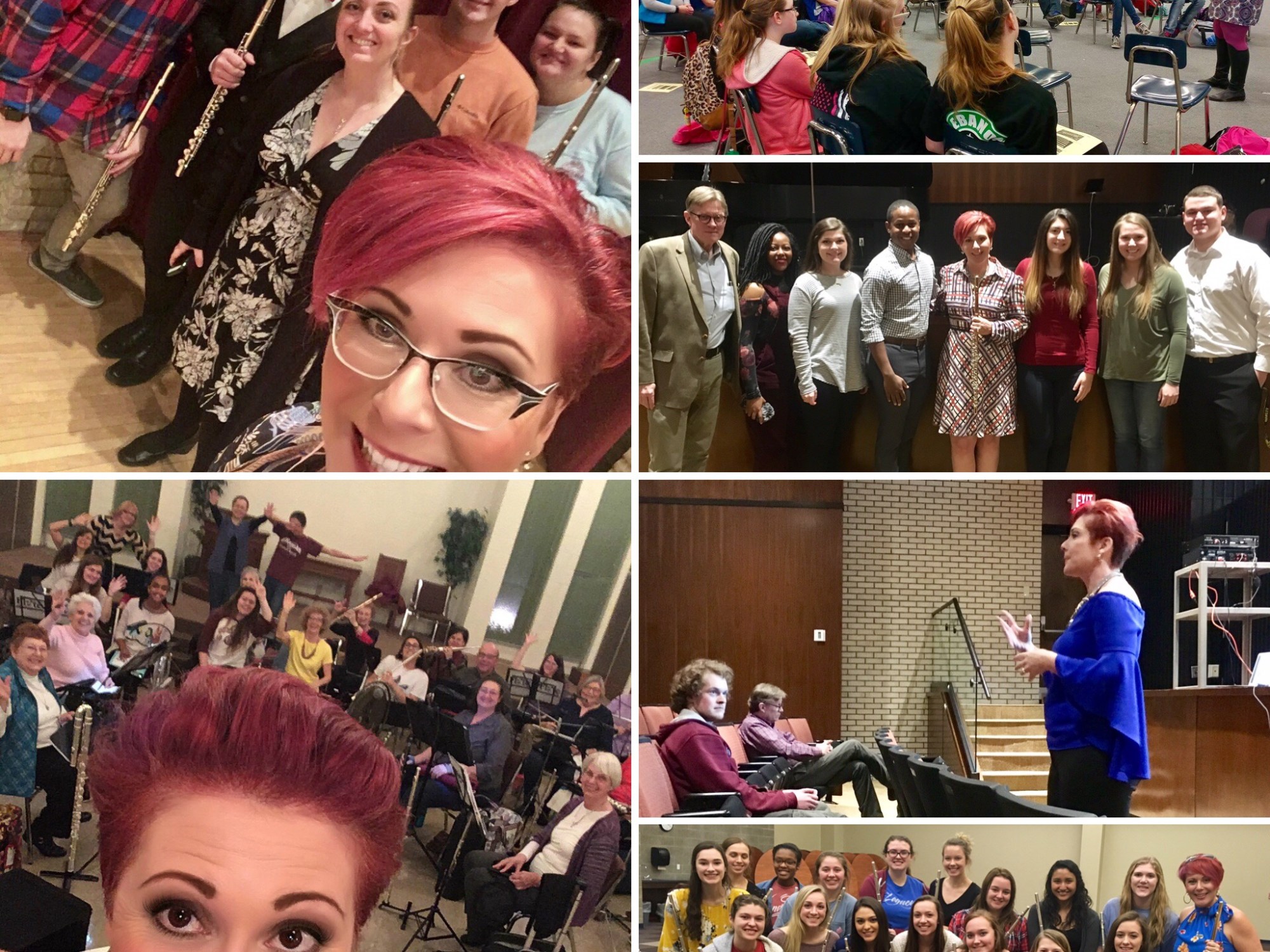 UNO’s Professor of Flute Christine Beard recently completed a 9 day tour in Arkansas and Missouri where she presented flute clinics for over 100 flute students at Bentonville High School, Bryant Middle School, Bryant High School, Bethel Middle School, Little Rock Central High School, and Hartville Middle School. In addition to engaging with students in the public schools, Dr. Beard’s tour also included working with the Hot Springs Flute Ensemble in rehearsal, and presenting music marketing lectures and teaching flute masterclasses to flute majors at both Henderson State University (Arkadelphia, AR) and at her alma mater of Arkansas State University (Jonesboro, AR). Her 3-day residency at ASU concluded with a guest solo recital with pianist Lauren Schack-Clark in a program of 21st-century works for flute and piccolo by Derek Charke, Keith Gates, Ian Clarke, Herman Beeftink, Dana Wilson, Matt Smith and Nebraska-based composer Daniel Baldwin.
