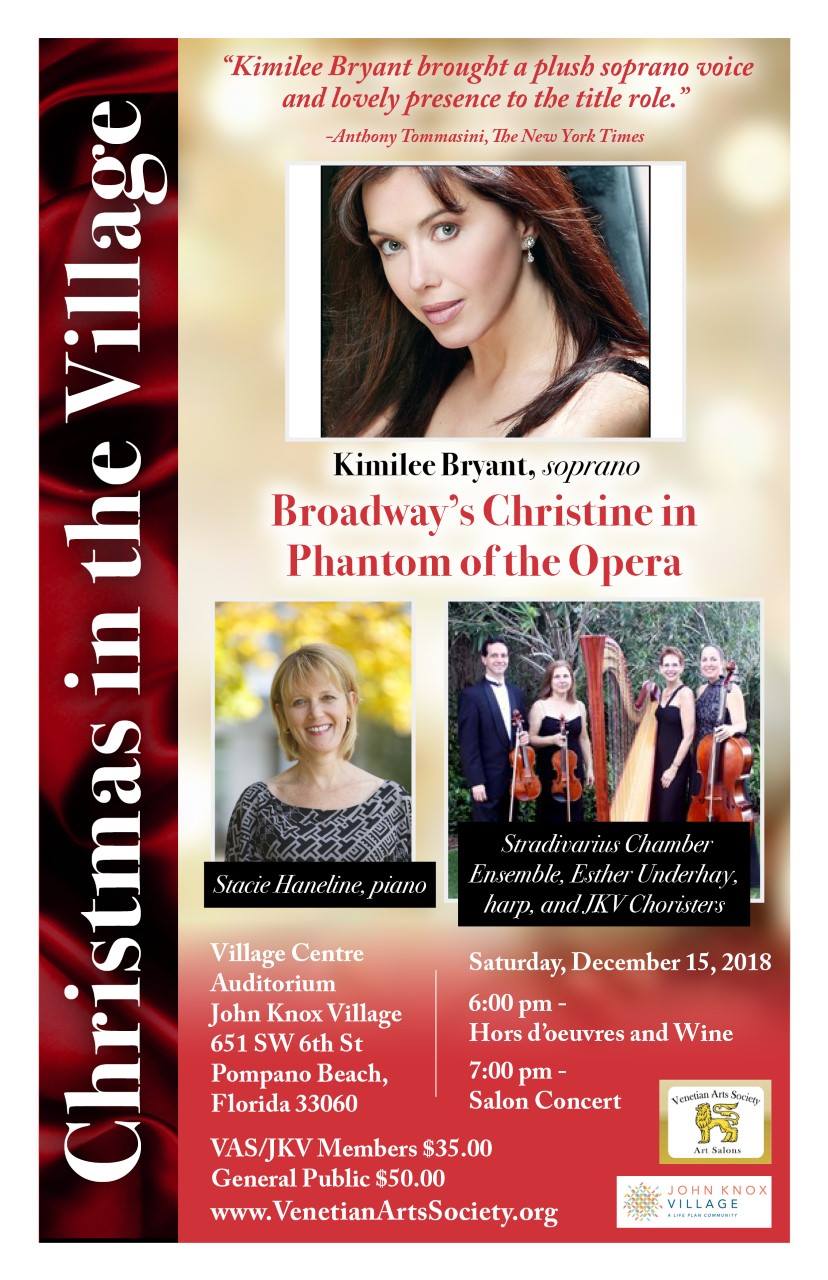 The Venetian Arts Society is delighted to bring guests artists to perform on the series this December to celebrate an elegant holiday experience. Featuring world class artists from the great stages of the world, the 2018 Christmas Extravaganza Broadway Star, Kimilee Bryant, pianist, Stacie Haneline and The Stradivarius String Quartet.