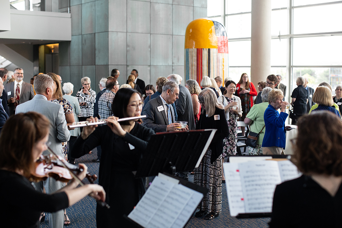 Dr. Matthew Brooks, UNO Director of Orchestras and Music Director of the Nebraska Medical Orchestra (NMO), was invited to speak at “A Night of Vision and Music” held at the Holland Performing Arts Center at which members of the NMO were featured performers. NMO musicians Sarah Holstein, M.D., Ph.D. and Melinda Chen, M.D., along with UNO faculty mentor Mary Perkinson, D.M.A., performed for hundreds of guests as part of the evening’s celebration.