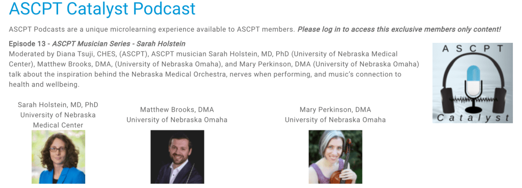 Dr. Matthew Brooks and Dr. Mary Perkinson were invited guests on the American Society for Clinical Pharmacology & Therapeutics’ (ASCPT) Catalyst Podcast featuring Sarah Holstein, MD, PhD. Dr. Holstein, a physician-scientist at UNMC, has played the flute since childhood and is a member of the Nebraska Medical Orchestra. In this episode of the ASCPT Musician Series, Drs. Holstein, Brooks, and Perkinson discuss two School of Music initiatives–Nebraska Medical Orchestra and Sound Health–as well as music’s relationship with medicine, health, and wellbeing.