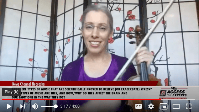 Associate Professor of Violin & String Education, Dr. Mary Perkinson, takes listeners on a 3-minute journey that ties research related to music and stress relief to specific musical works. Learn about how tempo, rhythm, and range contribute to stress relief. The segment was aired on News Channel Nebraska on January 4, 2021. Watch the segment here: https://www.youtube.com/watch?v=zSJ5ExmfUbA&t=1s