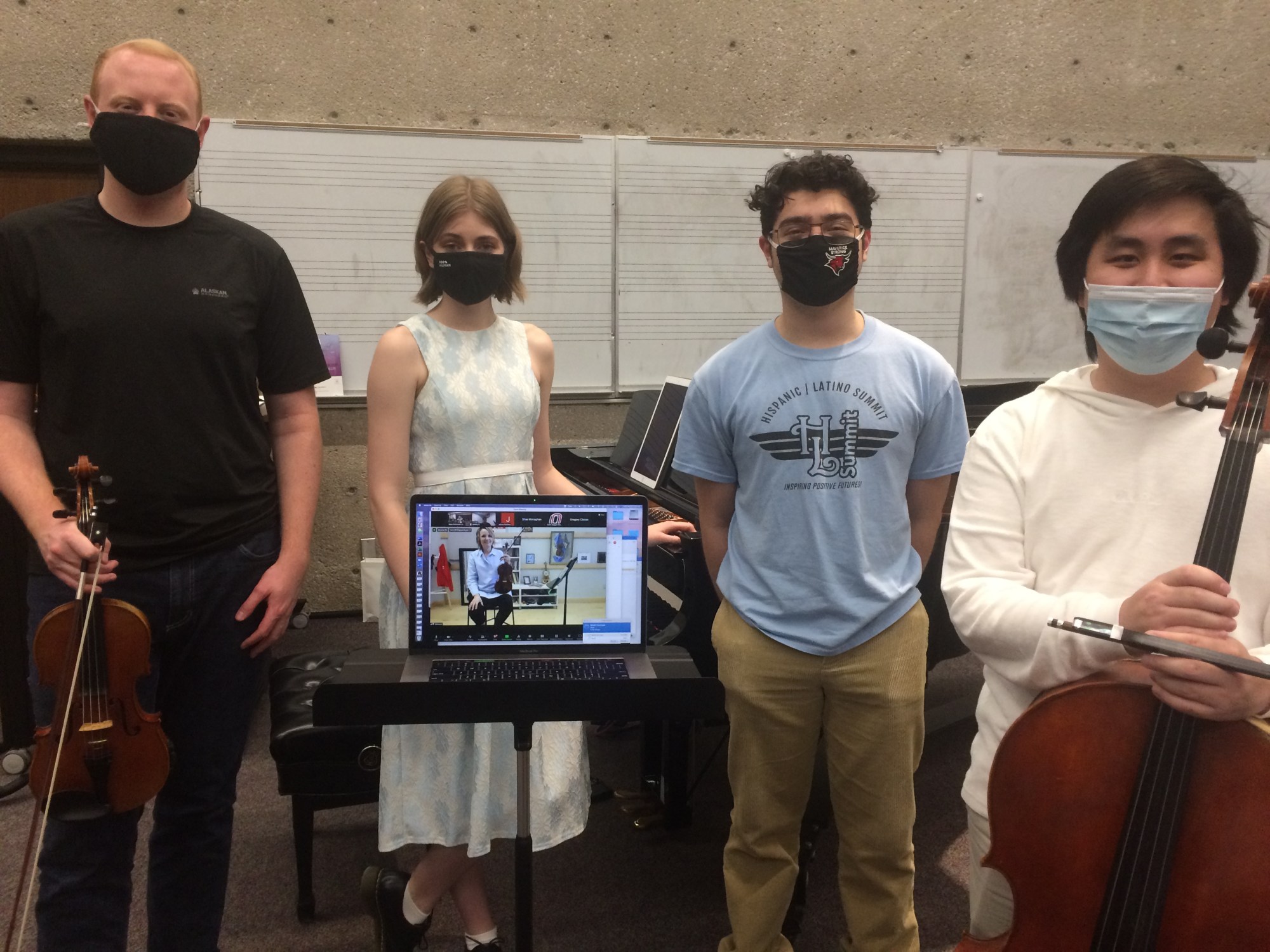 Emiliano Carrera-Ybanez, Steven Pruss, and Piano Trio (Steven Pruss, violin; Trevor Petersen, cello; Marissa Mathia, piano; coach Dr. Olga Smola), perform beautifully for guest artist Dr. Brenda Brenner, as part of the Spring 2021 String Area Guest Artist Series.