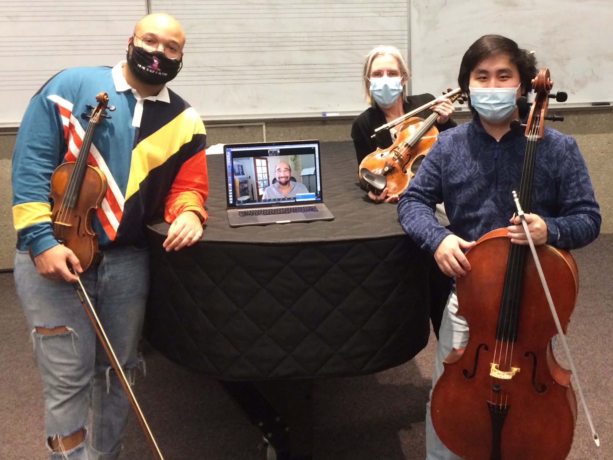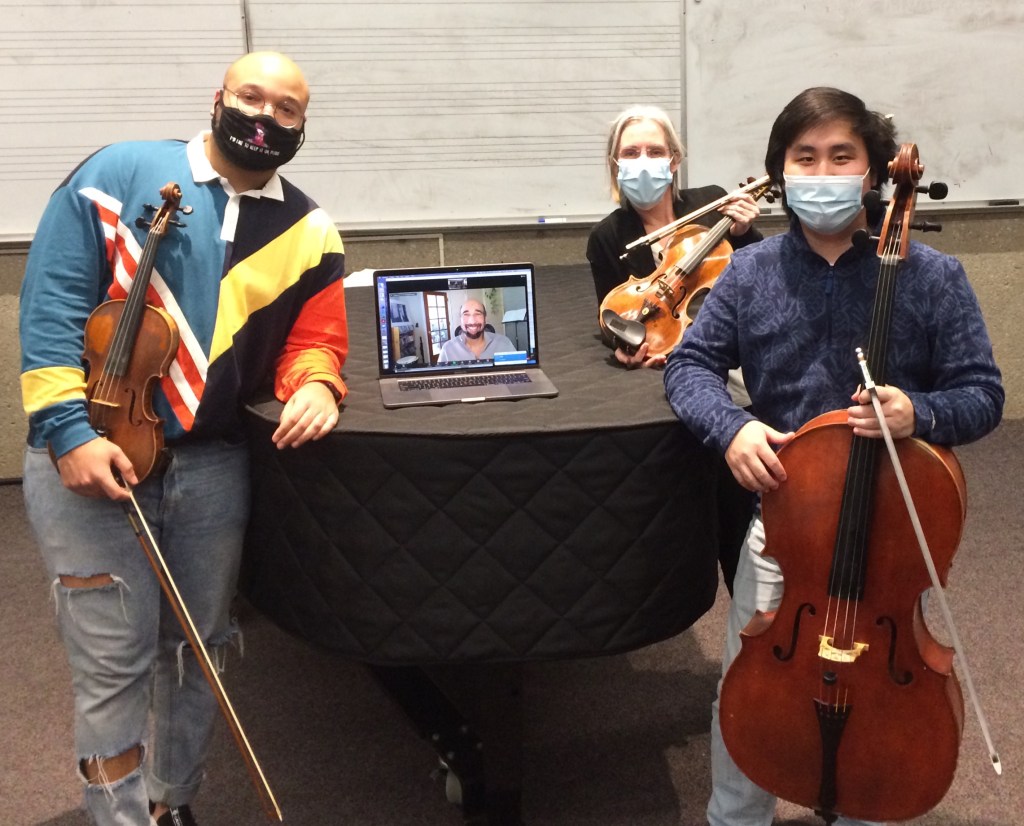 Jordan Willis, (MM violin performance X21), Trevor Petersen, (BM cello performance X22), and Dr. Mary Perkinson, Associate Professor of Violin and String Education perform Dreamwork for Dr. Gregory T.S. Walker in preparation for the work’s premiere on April 2. Join Dr. Walker, artist-in-residence, and UNO students and faculty as they present Powerful Perspectives, Music by Underrepresented Composers on 4/2 at 7pm. This recital was curated by graduate student Jordan Willis and represents a year’s worth of practice, research, and organization.