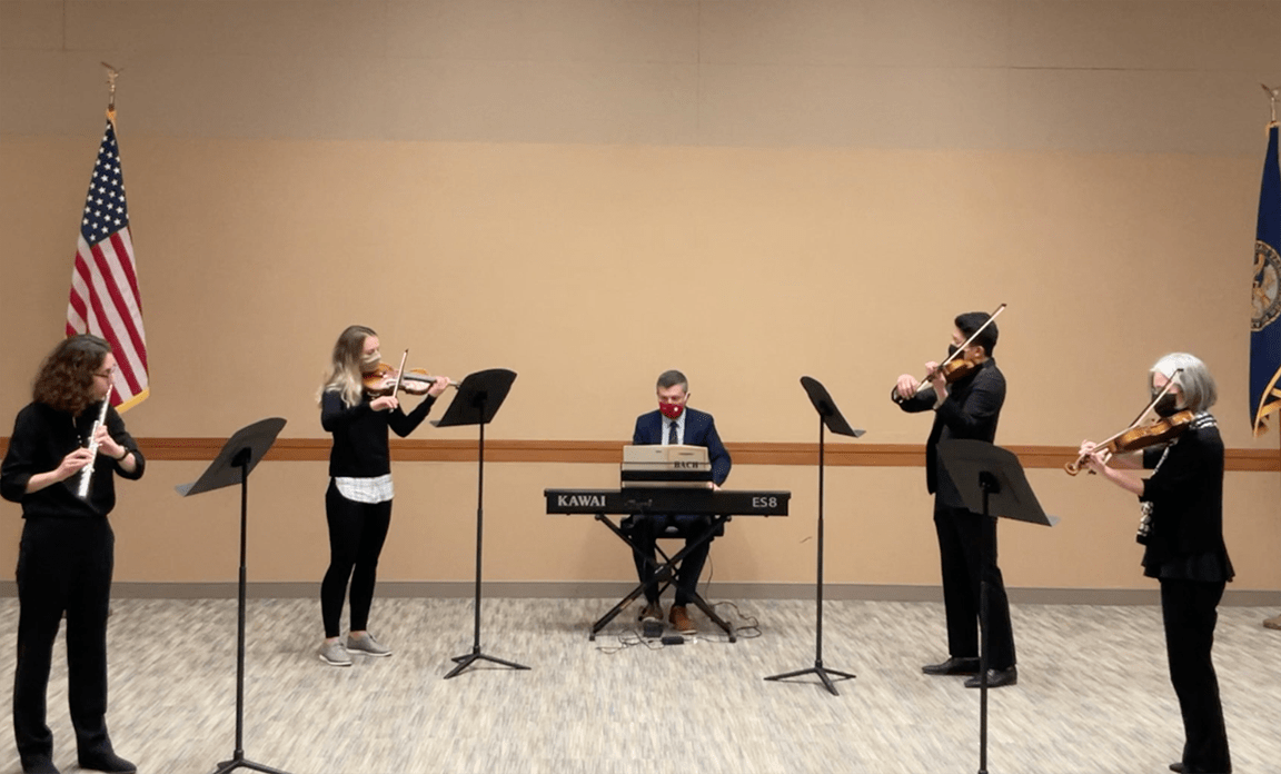 The Nebraska Medical Orchestra—a partnership between the UNO School of Music and the University of Nebraska Medical Center—honored the late Dr. Joseph Stothert with a musical performance featuring select members of the orchestra. Violinists Jake Son, MD/PhD student, and Rachael Neff, research technician and former UNO music alumna, and flutist Dr. Sarah Holstein, Associate Professor of Internal Medicine, Division of Hematology and Oncology, were joined by Dr. Mary Perkinson, Associate Professor of Violin and String Education, and Dr. Matthew Brooks, Assistant Professor of Music and Director of Orchestral Activities in Music & Medicine to honor the longtime UNMC/Nebraska Medicine trauma surgeon who took his own life on March 5, 2021.