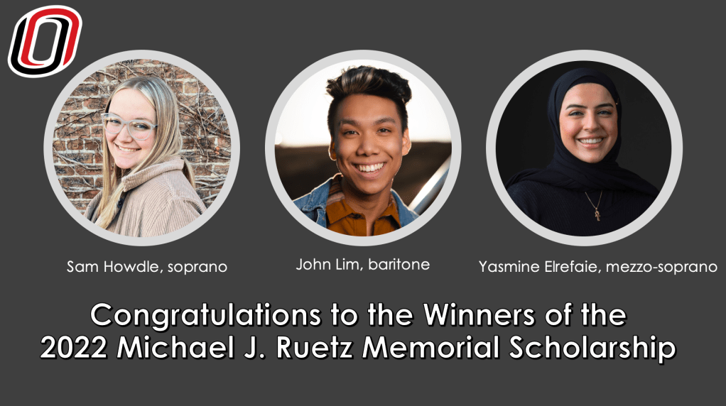 The voice area held auditions for the Michael J. Ruetz Memorial Scholarship competition on Monday, April 11th in the Jan & John Christenson Concert Hall at the School of Music. Nine singers competed and three students were named recipients of the scholarship.