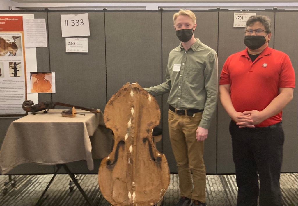 BA Music Entrepreneurial Studies major and bassist, Zach Jeppesen, presents his research poster, Rediscovering and Restoring the New England/American Three-string Double Bass Tradition, at the UNO 2022 UNO Research and Creative Activity Fair. Zach was a recipient of the 2021 FUSE (Fund for Undergraduate Scholarly Experiences) grant, which helped fund his research.