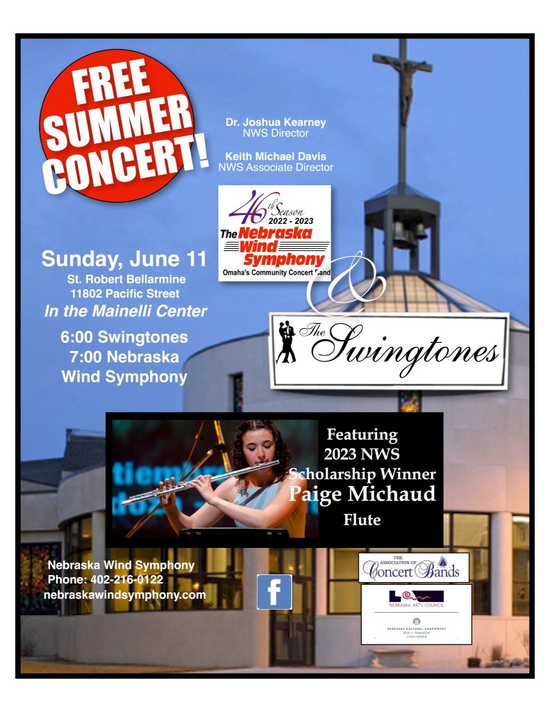 The concert is FREE and will be held at St. Robert Bellarmine Catholic Church at 11802 Pacific Street in west Omaha on Sunday, June 11 at 6:00pm. For more information, visit the Nebraska Wind Ensemble’s website or Facebook page.