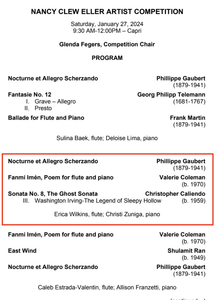 For the final round, all competitors were required to perform the French standard “Nocturne et Allegro Scherzando” by Philippe Gaubert in addition to works of each player’s choosing to complete a 20-minute recital program. After the Gaubert, Erica and Omaha-based pianist Christi Zuniga performed Valerie Coleman’s “Fanmi Imèn” and the technical showcase, “Washington Irving: The Legend of Sleepy Hollow” from Christopher Caliendo’s “Ghost” Sonata No. 8.