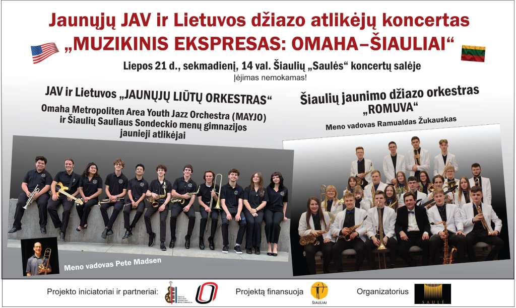 The USA Lithuania Young Lions Jazz Orchestra, a unique collaboration between students from Šiaulių Sauliaus Sondeckio menų gimnazija in Lithuania and the UNO-sponsored Metropolitan Area Youth Jazz Orchestra (MAYJO) from Omaha, Nebraska, has just concluded a highly successful European tour. Over the span of ten days, the ensemble showcased their talents with five captivating performances across three countries: Latvia, Lithuania, and Poland. The tour, which was deeply rooted in the sister city relationship between Šiauliai and Omaha, featured standout performances at prestigious jazz festivals in Saulkrasti, Tauragė and Chodiez, including a celebrated gala at the Saule Theater in Šiauliai.