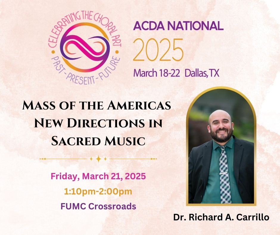 Director of Choral Activities, Dr. Richard Carrillo has been selected to present his research at the upcoming American Choral Directors Association National Convention in Dallas, TX. On average, the National ACDA Conference hosts over 20,000 choral directors from across the country and is the nation’s largest professional choral organization.