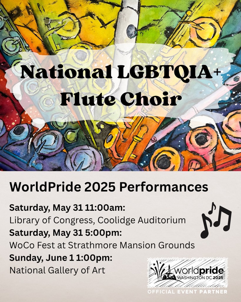 UNO’s Professor of Flute, Christine Beard, traveled to Washington, D.C., to perform as a member of the National LGBTQIA+ Flute Choir from May 30-June 1 as part of the 2025 World Pride festivities. Established in 2022 by Dr. Vincenzo Volpe, the National LGBTQIA+ Flute Choir was first conceived as part of the National Flute Association’s annual convention. A proud and devoted ally, Dr. Beard has been one of the 2 piccolo players in the ensemble since 2023. World Pride marks the first time the ensemble has performed outside the NFA Convention, with 4 concerts over 3 days at the famed Cooledge Auditorium in the Library of Congress, the Strathmore grounds, the Swedish Embassy, and the National Gallery of Art.