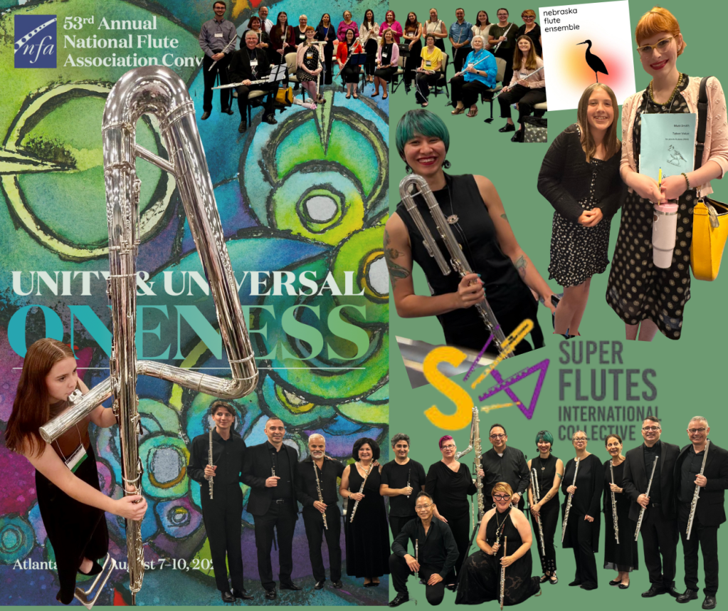 Nearly 3,000 flutists from around the globe gathered in Atlanta, GA for the 53rd National Flute Association Convention held August 6-10, 2025. UNO participants included sophomore UNO flute major Grace Dixon, a first-time attendee who performed as a member of the Nebraska Flute Ensemble and was also selected to perform as one of the 2 piccolo players in the convention’s closing flute choir. UNO Flute Studio alumni Kitty Boese (BM ’23) represented Pettry Piccolos in the exhibit hall and performed in the Nebraska Flute Ensemble, as did Heidi Korsmo, a community member in UNO’s Heartland Flute Choir. Leanna Keith (BM ’14) performed on a recital paying tribute to Seattle Symphony piccolo player Zart Dombourian-Eby and on a concert with the International SuperFlutes Collective, as well as beginning her new position as Chair of the NFA New Music Advisory Committee.