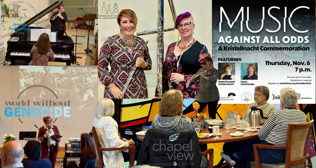 In November, Christie was invited to be the guest speaker for Kristallnacht commemorations hosted by both the Jewish Federation of Tulsa (OK) and World Without Genocide (St. Paul, MN). For these events, she presented her lecture-recital, “The Role of Music During the Holocaust” and was joined by pianist Christi Zuniga in Tulsa. During her travels, she also visited the UMKC Conservatory of Music, sharing her Holocaust lecture-recital with the UMKC flute studio, and performed at Chapelview Assisted Living in Burnsville, MN.