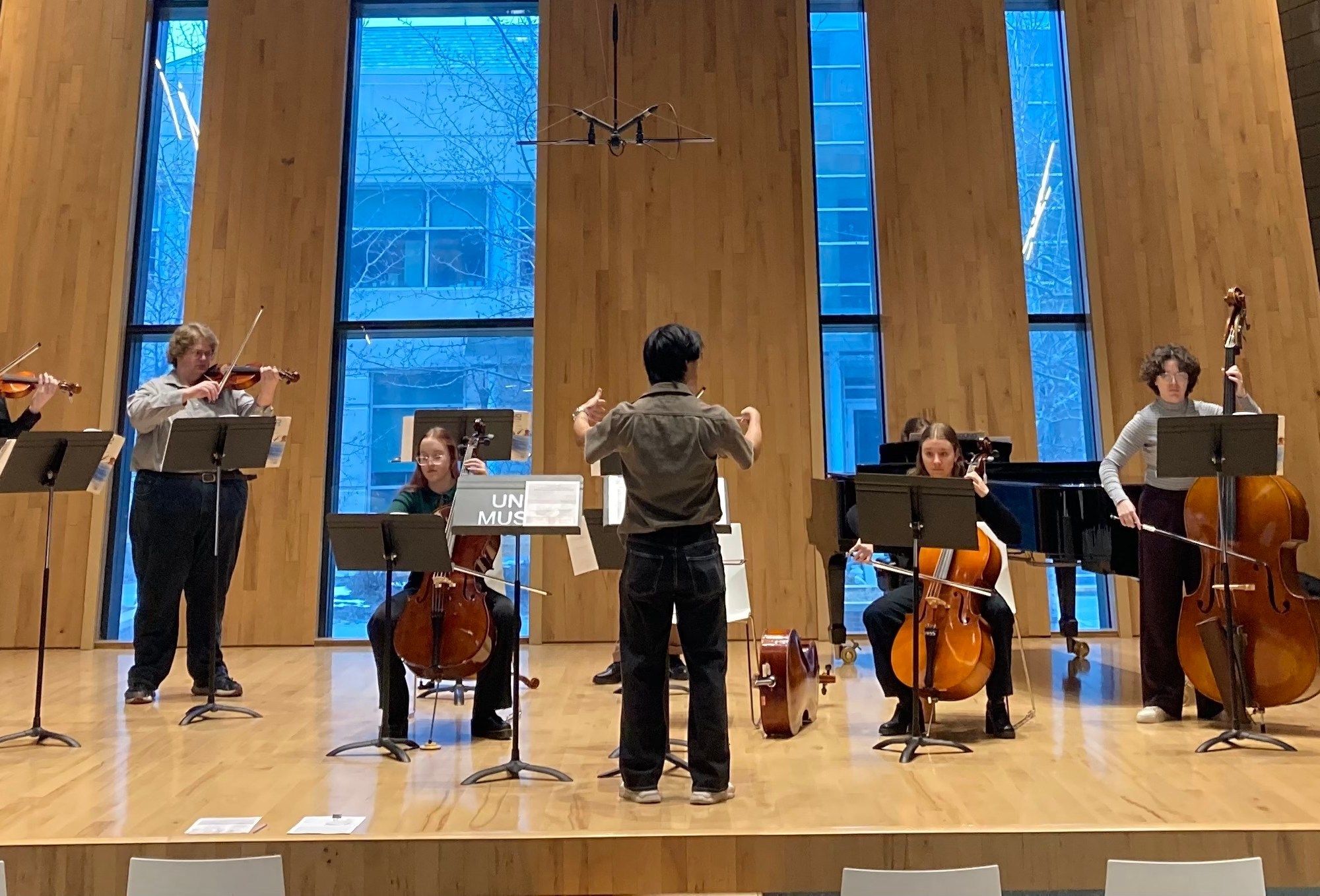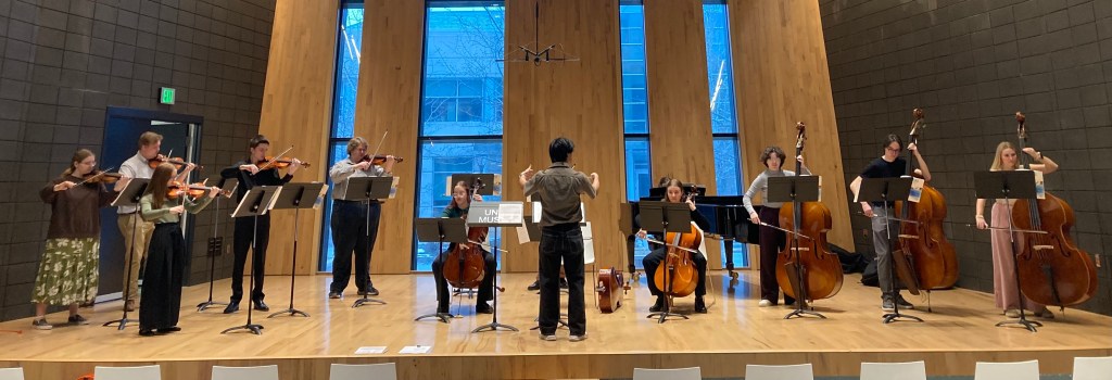 Beginning & Intermediate string and guitar students perform for a packed house. Music Education students enrolled in Music Education Technique: Strings & Guitar, celebrate the end of their class with a recital filled with classics such as Twinkle, Twinkle Little Star, Frere Jacques & theme from Mahler 1, mvt. 2, What Makes you Beautiful, & Hallelujah.